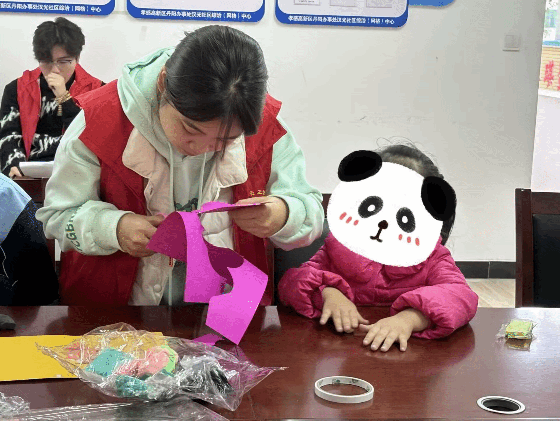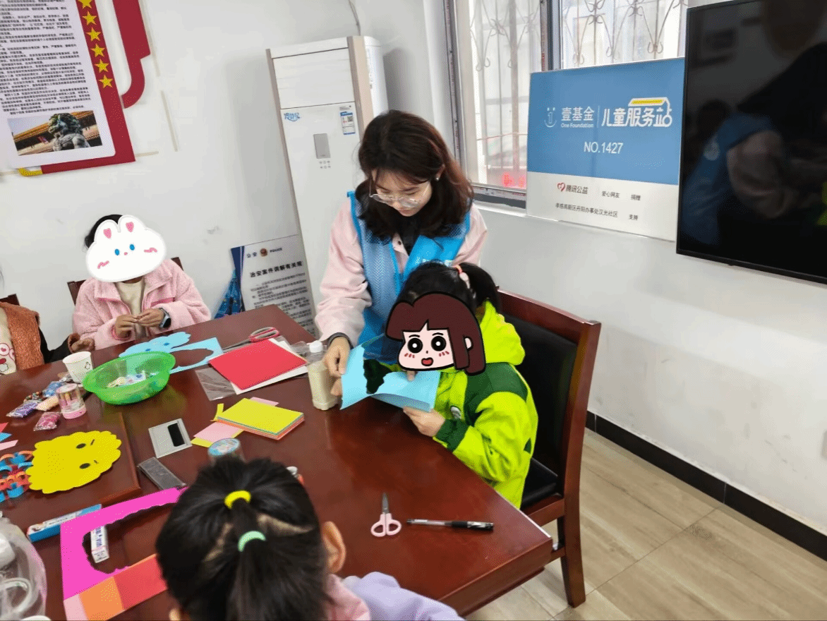 制作过程中,志愿者鼓励小朋友发挥想象。有的用蜡笔在云朵上画彩虹,让吊饰更绚丽;有的用彩纸剪出星星、心形粘贴在周围,营造浪漫氛围。志愿者穿梭其中指导,耐心帮助小朋友解决超轻黏土粘手、双面胶缠绕等问题。