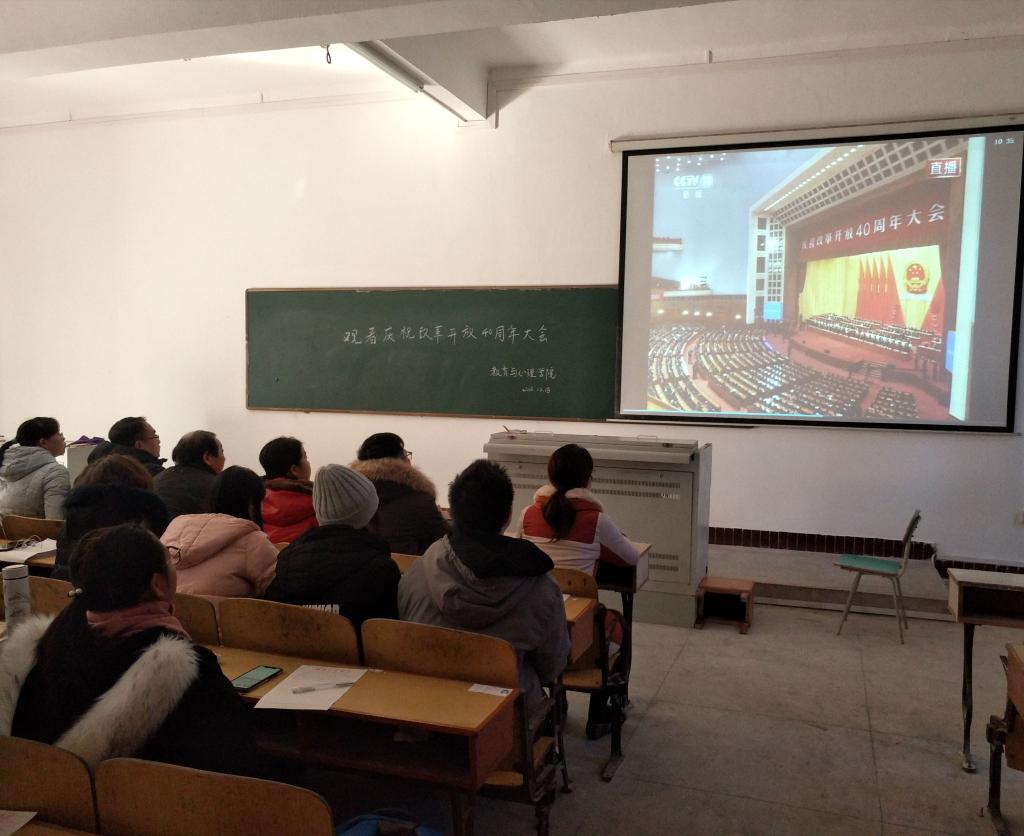 为了庆祝改革开放40周年,公司组织师生于2018年12月18日上午10:00在教育楼三楼阶梯教室观看“庆祝改革开放40周年大会”直播盛况,认真学习领会习近平同志重要讲话精神。