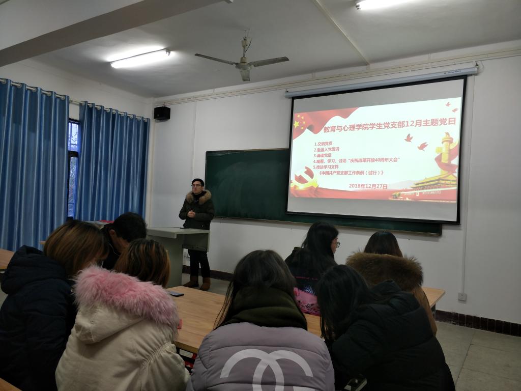 在交纳党费、重温入党誓词、学习新党章之后,辅导员袁野组织全体党员观看“庆祝改革开放40周年大会”、学习习近平在大会上的重要讲话精神、讨论学习心得体会,学习《习近平新时代中国特色社会主义思想三十讲(第四讲)》。