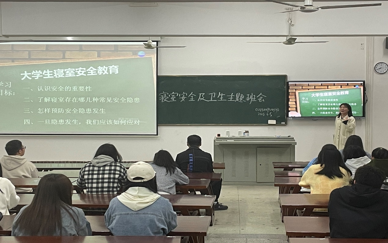 最后,心理班班长杨萱同学结合实际,组织开展了老员工寝室安全及卫生主题班会,旨在提高同学们的安全和卫生意识,保障同学们的寝室安全。在老员工寝室安全教育的宣传中,杨萱同学目标明确、语言幽默、讲解清楚明了、重点突出,贴合当前老员工寝室生活实际,明确提出了隐患预防和隐患发生应对,既是一场生动的安全教育主题班会,更是一次非常精彩的“班级员工讲堂”展示。