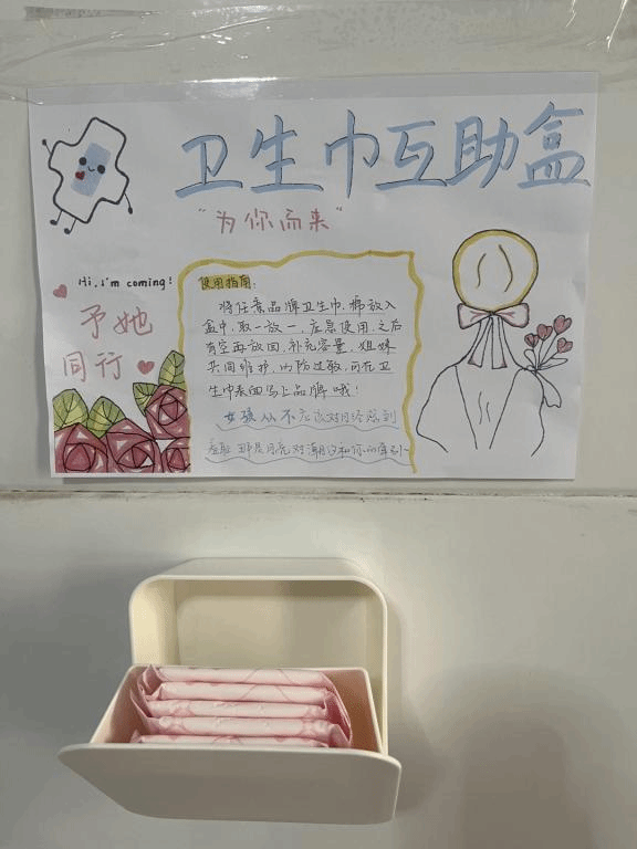 3月8日上午,青协志愿者们制作精致的“卫生巾互助盒”并将其放入各院教学楼的女厕所,以帮助突发状况而未有准备的女同学,并引导同学们大方、坦然地面对每个月的“不期而遇”。志愿者们还设计和制作了充满关爱和温情的海报,贴心提醒的同时分享一些生理卫生知识。