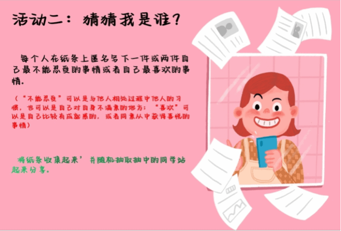 然后,通过一个小游戏“猜猜我是谁?"来进一步让同学们剖析自己从而更好的接受自己。