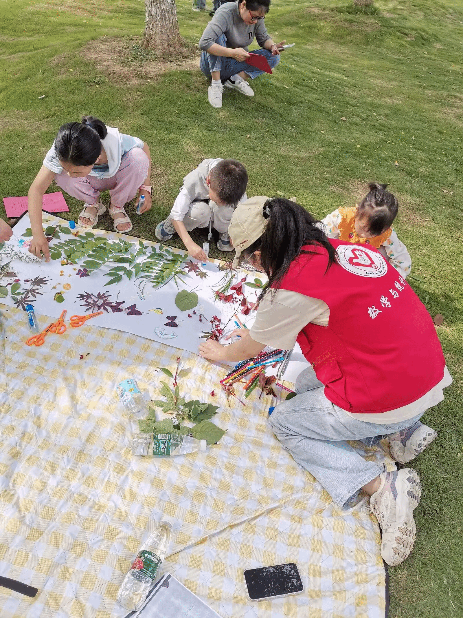 在阳光明媚的户外,志愿者和小朋友们一起进行户外活动,一起进行游戏创作,激发小朋友们的想象力与游戏热情,一起度过了一个美好而有意义的下午!