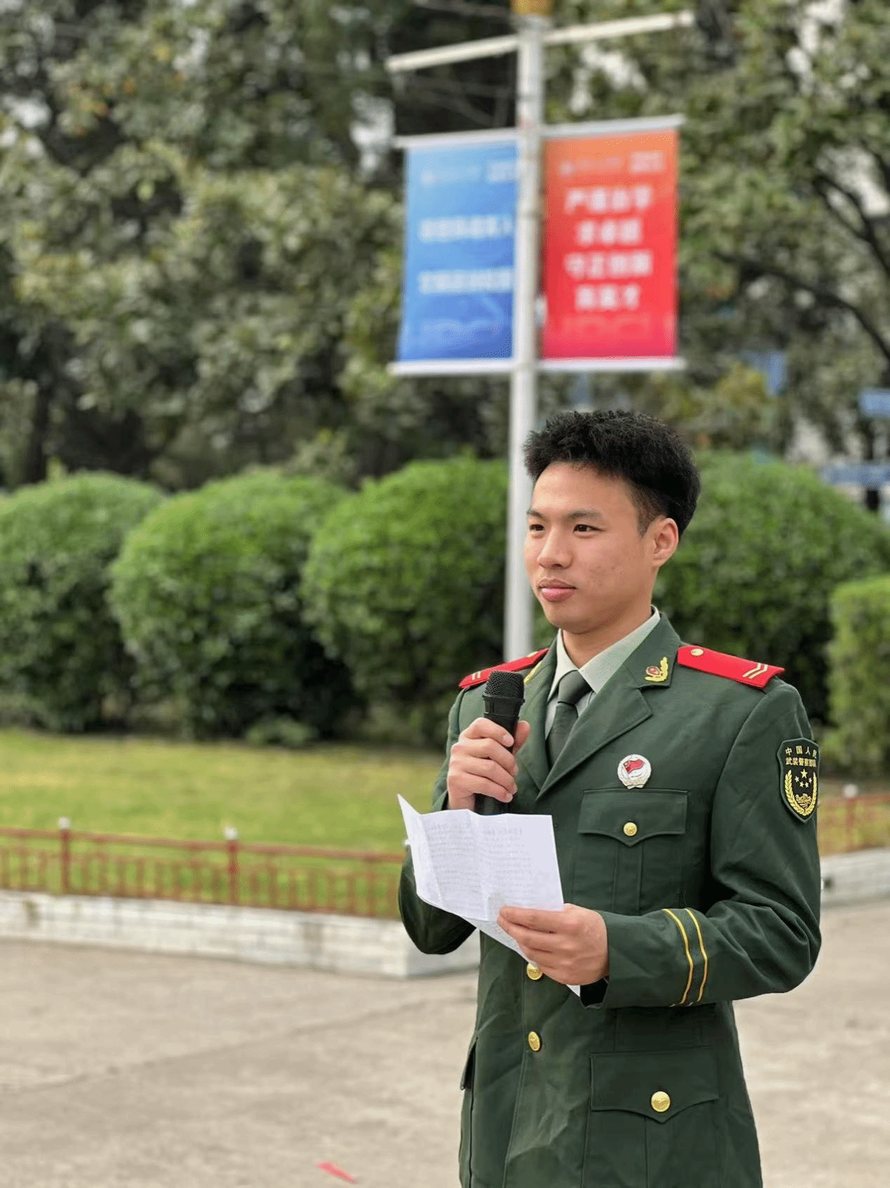 升旗仪式结束后,入党积极分子郭梦涵同学分享自己的党课学习心得,并结合实际,讲述了自己参与志愿服务活动的经历,鼓励同学们积极投身志愿服务,在奉献中培育集体主义精神和团结意识,从身边小事做起,践行爱国精神。退伍军人员工代表程威同学则分享了他的军旅生涯。他回忆起在部队里经历的艰苦训练和执行任务时的难忘瞬间,感慨部队生活极大地磨炼了自己的意志。他鼓励同学们学习军人艰苦奋斗的作风,在学习中不怕困难,勇攀知识高峰,为将来投身教育事业打下坚实基础 。