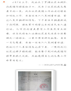 在此次疫情防控期间,公司许多员工积极投身于抗疫志愿活动之中,为打赢这场防疫阻击战贡献自己的青春力量,彰显了当代老员工的责任与担当。在此次活动中,我们也收集到了公司许多抗疫志愿者的小故事。