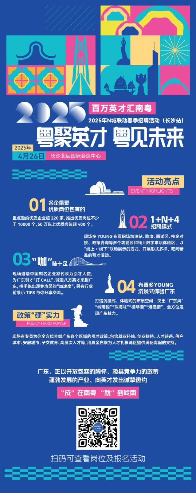 站在新时代的起点,我们深知,人才是发展的核心动力,而青年正是最具创造力与潜力的群体。广东,愿成为你施展才华的舞台--从粤港澳大湾区的国际视野,到深圳的创新基因;从广州的商贸底蕴,再到珠海这座青春之城、活力之都的无限可能。